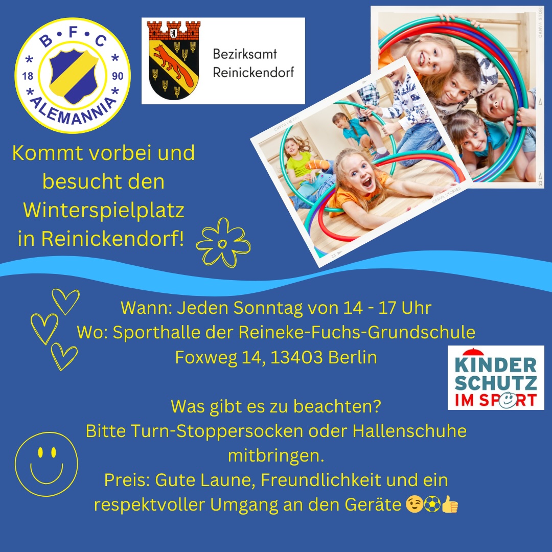 In der Sporthalle der Reineke-Fuchs-Grundschule, Foxweg 15, 13403 Berlin, können Kinder bis zehn Jahre unter der Aufsicht erfahrener Übungsleiterinnen und Übungsleiter des BFC Alemannia sonntags von 14 bis 17 Uhr spielen und turnen. Neu in diesem Jahr ist ein zweiter Winterspielplatz in der Halle der Märkischen Grundschule, Dannenwalder Weg 163, 13439 Berlin. Hier bietet der TSV Berlin-Wittenau ein Indoor-Spielangebot für Kinder bis sieben Jahre an, unter dem Motto „Spiel und Spaß für Kinder bis 7 Jahre.“